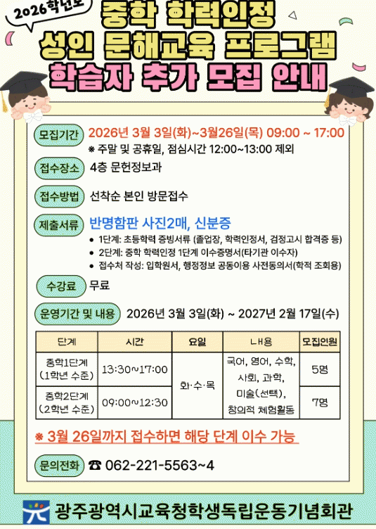 ȸ°üÀº ´õ ¸¹Àº ½Ã¹Î¿¡°Ô ±âȸ¸¦ Á¦°øÇϱâ À§ÇØ ÁßÇÐ ÇзÂÀÎÁ¤ ¼ºÀÎ ¹®Çر³À° ¼ö°»ýÀ» Ãß°¡·Î ¸ðÁýÇÑ´Ù.