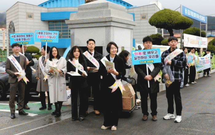À̳¯ Çà»ç¿¡´Â Çϼ÷ÀÚ ±³À°ÀåÀ» ºñ·ÔÇØ ±³À°Áö¿øÃ» °ü°èÀÚ, Áøµµ±ºÃ», Áøµµ°æÂû¼, ÁøµµÁßÇб³ ±³Á÷¿ø, Çкθðȸ¿Í ÁøµµÁß ÇлýÀÚġȸ Çлý µîÀÌ Âü¿©ÇØ µî±³ÇÏ´Â Çлýµé¿¡°Ô Àλç¿Í ÀÀ¿øÀÇ ¸Þ½ÃÁö¸¦ ÀüÇß´Ù. Âü°¡ÀÚµéÀº ¡®¼·Î ¹è·ÁÇÏ´Â ÇൿÀÌ ½Å·Ú¸¦ ¸¸µì´Ï´Ù¡¯, ¡®´Ù¸§À» ÀÎÁ¤ÇÏ´Â °ÍÀÌ Á¸ÁßÀÇ ½ÃÀÛÀÔ´Ï´Ù¡¯¶ó´Â ¹®±¸°¡ ÀûÈù ÇÇÄÏ µîÀ» Ȱ¿ëÇÏ¿© Ä·ÆäÀΠȰµ¿À» ÆîÃÆ´Ù.