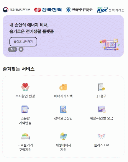 À̹ø Ç÷§ÆûÀº ÀÏ¹Ý °¡Á¤, ¼Ò»ó°øÀÎ, »ê¾÷ü µî ¿ä±Ý Àý°¨ ÆÁÀÌ ÇÊ¿äÇϰųª ´ÙÀڳࡤÃâ»ê °¡±¸ ¹× ¿¡³ÊÁö Ãë¾à°èÃþ µî ¿ä±Ý Áö¿ø ÇýÅÃÀÌ ÇÊ¿äÇÑ ¸ðµç °í°´À» À§ÇØ ÇÑÀü, Çѱ¹¿¡³ÊÁö°ø´Ü, Àü·Â°Å·¡¼Ò µî 7°³ ±â°ü¿¡ Èð¾îÁ® ÀÖ´ø Àü±â »ç¿ë°ú Àç»ý¿¡³ÊÁö °ü·Ã ¼ºñ½º 39Á¾À» ÅëÇÕÇß´Ù. À̸¦ ÅëÇØ ¼ºñ½º Á¤º¸ È®ÀÎÀ» À§ÇØ °¢ ±â°ü ȨÆäÀÌÁö¸¦ ÀÏÀÏÀÌ ¹æ¹®ÇØ¾ß Çß´ø ¹ø°Å·Î¿òÀ» ȹ±âÀûÀ¸·Î °³¼±Çß´Ù.