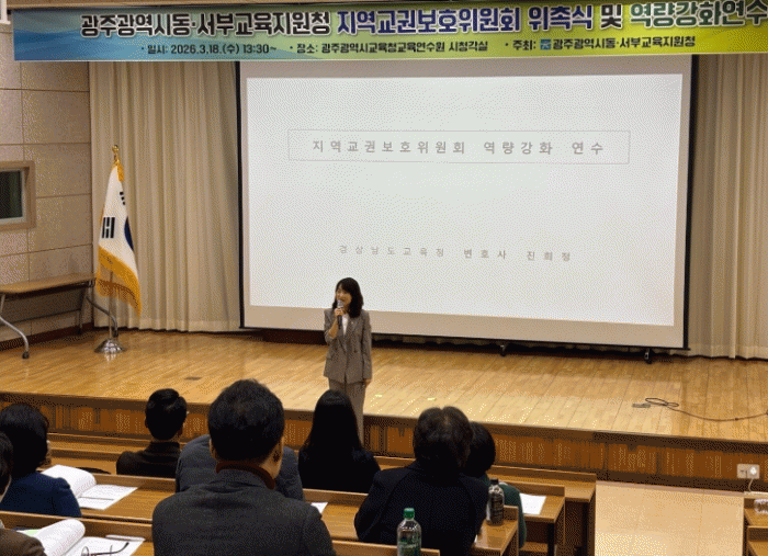 °æ»ó³²µµ±³À°Ã» ÁøÈñÁ¤ º¯È£»ç°¡ 18ÀÏ ±¤Áֽñ³À°Ã»±³À°¿¬¼ö¿ø¿¡¼­ ±¤ÁÖµ¿¡¤¼­ºÎ±³À°Áö¿øÃ» Á¦2±â Áö¿ª±³±Çº¸È£À§¿øÈ¸ À§¿øÀ» ´ë»óÀ¸·Î ¿ª·® °­È­ ¿¬¼ö¸¦ ÁøÇàÇϰí ÀÖ´Ù.