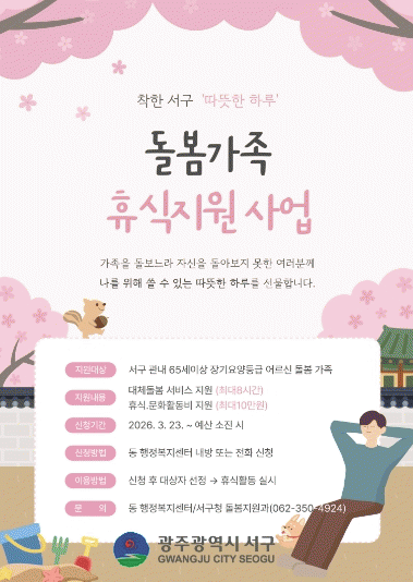 Áö¿ø ´ë»óÀº ¼±¸¿¡ °ÅÁÖÇÏ¸é¼ ÇÏ·ç 8½Ã°£ ÀÌ»ó °¡Á·À» µ¹º¸´Â ÁÖ¹ÎÀ¸·Î Àå±â¿ä¾ç 1~2µî±Þ ¶Ç´Â Ä¡¸Å°¡ ÀÖ´Â 3~4µî±Þ ´ë»óÀÚ¸¦ 6°³¿ù ÀÌ»ó µ¹º¸´Â °¡±¸´Ù. »ç¾÷ Âü¿© Èñ¸ÁÀÚ´Â °ÅÁÖÁö µ¿ ÇàÁ¤º¹Áö¼¾ÅÍ ¶Ç´Â ¼±¸Ã» µ¹º½Áö¿ø°ú¸¦ ÅëÇØ ½ÅûÇÏ¸é µÈ´Ù.