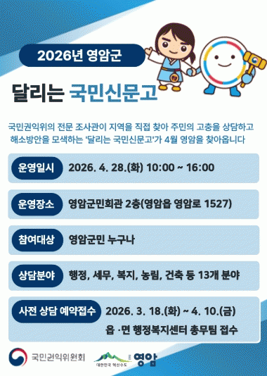 À̹ø ±¹¹Î½Å¹®°í´Â 4¿ù 28ÀÏ ¿ÀÀü 10½ÃºÎÅÍ ¿ÀÈÄ 4½Ã±îÁö ¿µ¾Ï±º¹Îȸ°ü¿¡¼ ¿¸°´Ù. ±¹¹Î±ÇÀÍÀ§¿øÈ¸ Àü¹® Á¶»ç°üÀÌ Á÷Á¢ ÇöÀåÀ» ã¾Æ ÇàÁ¤¡¤º¹Áö»Ó ¾Æ´Ï¶ó »ýȰ¹ý·ü, ¼¹Î±ÝÀ¶, ¼ÒºñÀÚ ÇÇÇØ±¸Á¦ µî ´Ù¾çÇÑ ºÐ¾ßÀÇ ¹Î¿øÀ» »ó´ãÇÑ´Ù.
