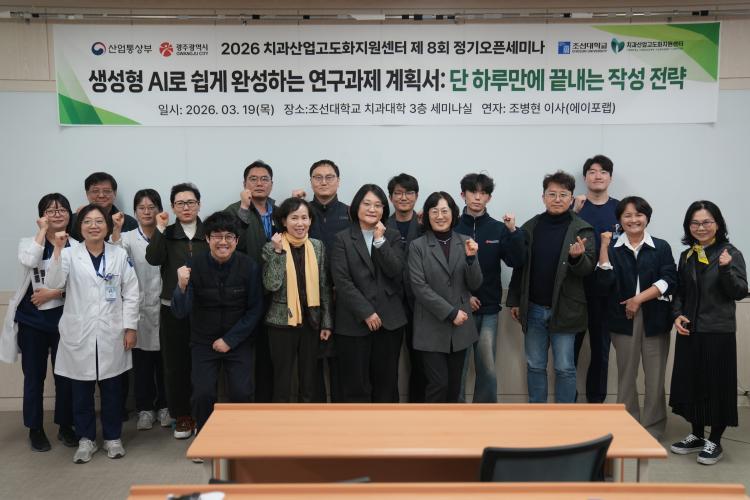 Á¶¼±´ë Ä¡°ú»ê¾÷°íµµÈÁö¿ø¼¾ÅÍ´Â 3¿ù 19ÀÏ Ä¡°ú´ëÇÐ 3Ãþ °ø¿ë¼¼¹Ì³ª½Ç¿¡¼ ¡®»ý¼ºÇü AI·Î ½±°Ô ¿Ï¼ºÇÏ´Â ¿¬±¸°úÁ¦ °èȹ¼: ´Ü ÇÏ·ç ¸¸¿¡ ³¡³»´Â ÀÛ¼º Àü·«¡¯À» ÁÖÁ¦·Î Á¦8ȸ Á¤±â ¿ÀǼ¼¹Ì³ª¸¦ °³ÃÖÇß´Ù.