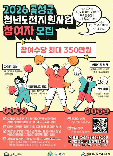 »ç¾÷¿¡ °üÇÑ ÀÚ¼¼ÇÑ Á¤º¸´Â ¡®°î¼º±º û³âµµÀüÁö¿ø»ç¾÷ ÅëÇÕ ¾È³» ÆäÀÌÁö¡¯¿¡¼ È®ÀÎÇÒ ¼ö ÀÖÀ¸¸ç, ±âŸ ¹®ÀÇ »çÇ×Àº ¿î¿µ±â°üÀÎ (»ç)¹Ì·¡±â¼ú»ê¾÷ÁøÈï¿ø û³âµµÀüÁö¿ø»ç¾÷(°î¼º) »ç¹«±¹À¸·Î ¹®ÀÇÇÒ ¼ö ÀÖ´Ù.