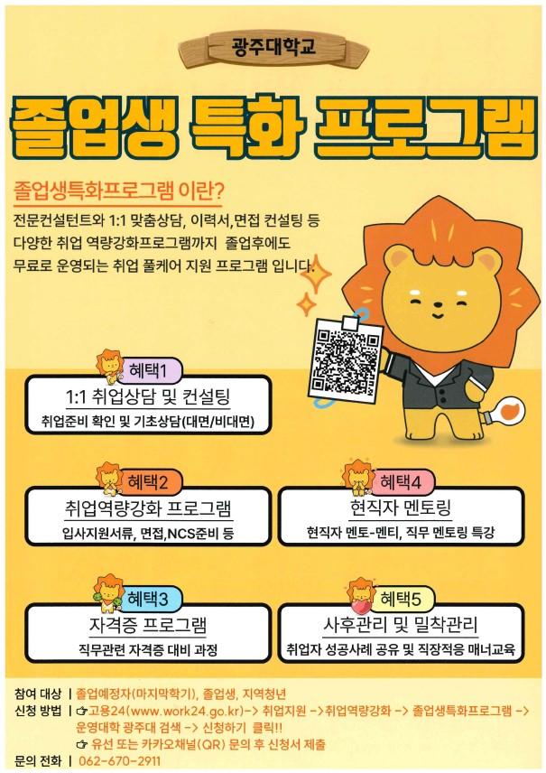 Á¹¾÷»ýƯÈÇÁ·Î±×·¥Àº ±¤ÁÖ´ë Á¹¾÷ ¿¹Á¤ÀÚ, Á¹¾÷»ý, Áö¿ªÃ»³âÀ» ´ë»óÀ¸·Î Àü¹®ÄÁ¼³ÅÏÆ®¿Í 1:1 ¸ÂÃãÇü»ó´ã, À̷¼ ¹× ¸éÁ¢ÄÁ¼³ÆÃ, ´Ù¾çÇÑ Ãë¾÷¿ª·®°È ÇÁ·Î±×·¥ÀÎ ¼ö¿äÀÚÁ᫐ ÇÁ·Î±×·¥, ÀÚ±âÁÖµµÇü ÇÁ·Î±×·¥, ÇöÁ÷ÀÚ ¸àÅ丵 ÇÁ·Î±×·¥À» Áö¿øÇÏ´Â »ç¾÷ÀÌ´Ù.