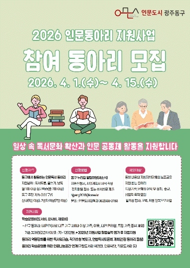½Åû ´ë»óÀº ±¤ÁÖ µ¿±¸ °ü³»¿¡¼ Ȱµ¿Çϴ û³â¡¤Á÷ÀåÀΡ¤ÁֹΠµî 5ÀÎ ÀÌ»óÀ¸·Î ±¸¼ºµÈ ¼Ò¸ðÀÓÀÌ´Ù. ¿ù 1ȸ ÀÌ»ó Á¤±âÀûÀ¸·Î ¸ðÀÓÀ» ¿î¿µÇØ¾ß Çϸç, µ¶¼ Åä·Ð¡¤±Û¾²±â¡¤³¶µ¶ µî Ã¥À» ±â¹ÝÀ¸·Î ÇÑ ´Ù¾çÇÑ È°µ¿À» ¼öÇàÇÏ´Â µ¿¾Æ¸®¸é ½ÅûÇÒ ¼ö ÀÖ´Ù.
