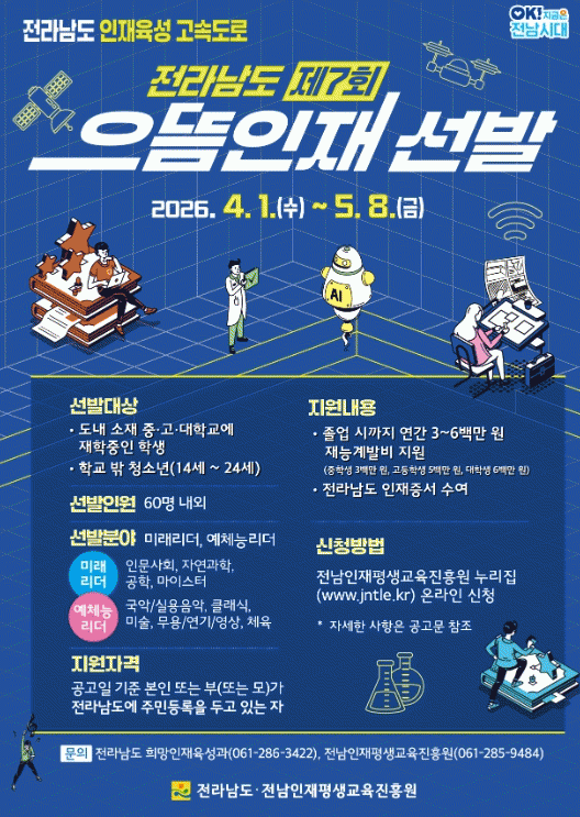¿ÃÇØ´Â Áö¿ª Áß¡¤°í¡¤´ëÇлýÀ» ´ë»óÀ¸·Î Àι®»çȸ, ÀÚ¿¬°úÇÐ, °øÇÐ, ¸¶À̽ºÅÍ µî ¡®¹Ì·¡¸®´õ¡¯¿Í ±¹¾Ç¡¤½Ç¿ëÀ½¾Ç, Ŭ·¡½Ä, ¹Ì¼ú, ¹«¿ë¡¤¿¬±â¡¤¿µ»ó, üÀ° µî ¡®¿¹Ã¼´É ¸®´õ¡¯, 2°³ ºÐ¾ß¿¡¼ ÃÑ 60¿© ¸íÀ» ¼±¹ßÇÑ´Ù.