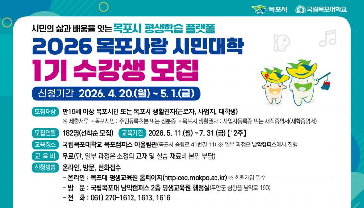 À۳⿡ ÀÌ¾î ¿ÃÇØµµ ÁøÇàÇÏ´Â ¡®¸ñÆ÷»ç¶û ½Ã¹Î´ëÇС¯ 1±â °úÁ¤Àº 5¿ù 11ÀϺÎÅÍ 7¿ù 31ÀϱîÁö ÃÑ 12ÁÖ°£ ÁøÇàµÇ¸ç, Àü¹® ÀÚ°Ý °úÁ¤ÀΠâÀÛ°ø¿¹À£´Ï½ºÁöµµ»ç µî 12°³ °úÁ¤ÀÌ °³¼³µÇ¸ç, ±³À°Àº ±¹¸³¸ñÆ÷´ë ¸ñÆ÷Ä·ÆÛ½º¿Í ³²¾ÇÄ·ÆÛ½º¿¡¼ ÁøÇàµÈ´Ù.