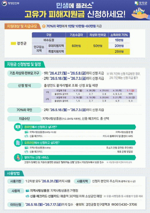 1Â÷´Â ±âÃÊ»ýȰ¼ö±ÞÀÚ, Â÷»óÀ§°èÃþ, ÇѺθð°¡Á·À» ´ë»óÀ¸·Î 4¿ù 27ÀϺÎÅÍ 5¿ù 8ÀϱîÁö ÁøÇàµÇ¸ç, 2Â÷´Â 5¿ù 18ÀϺÎÅÍ 7¿ù 3ÀϱîÁö ¼Òµæ ÇÏÀ§ 70% ±º¹ÎÀ» Æ÷ÇÔÇØ ½ÅûÀ» ¹Þ´Â´Ù.