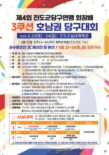 Áøµµ±ºÃ¼À°È¸°¡ ÁÖÃÖÇϰí Áøµµ±º´ç±¸¿¬¸ÍÀÌ ÁÖ°üÇÏ´Â ´ëȸ·Î, ´ëÇѴ籸¿¬¸Í°ú ÇǺñ¿¡ÀÌ(PBA) µî·Ï ¼±¼ö¸¦ Á¦¿ÜÇÑ ½Ã±º ¿¬¸Í ¼Ò¼ÓÀÇ µ¿È£ÀÎÀ» ´ë»óÀ¸·Î ÁøÇàµÇ¸ç, °³È¸½ÄÀº 5¿ù 24ÀÏ ¿ÀÀü 11½Ã¿¡ °³ÃֵȴÙ.