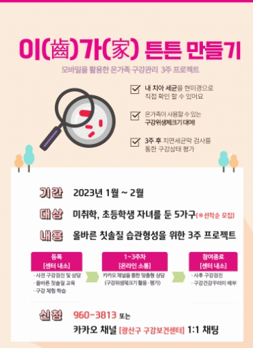 ¶ÇÇÑ ±¤»ê±¸ ¿ì»ê°Ç°»ýȰÁö¿ø¼¾Å͸¦ ¹æ¹®ÇØ Çö¹Ì°æÀ¸·Î ÀÔ ¼Ó °Ç° »óŸ¦ È®ÀιÞÀ» ¼ö ÀÖ´Ù. 1:1 Ä©¼ÖÁú ±³À°, Ä¡¾ÆÈ¨¸Þ¿ì±â ½Ç½À µî ¾ÆÀ̵éÀÇ Èï¹Ì¿Í °ü½ÉÀ» ³ôÀ̱â À§ÇÑ Ã¼ÇèÇÁ·Î±×·¥µµ Á¦°øÇÑ´Ù.