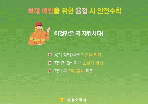 ÀÌ¿¡ ¼Ò¹æ¼´Â °ø»çÀå ¾ÈÀü°ü¸® °È¸¦ À§ÇØ ¿ëÁ¢¤ý¿ë´Ü ÀÛ¾÷ ½Ã ÈÀç À§Ç輺°ú °æ°¢½ÉÀ» °íÃëÇϱâ À§ÇÑ ¾ÈÀü¼öÄ¢À» Áö¼ÓÇØ¼ È«º¸ÇÒ ¹æÄ§ÀÌ´Ù.