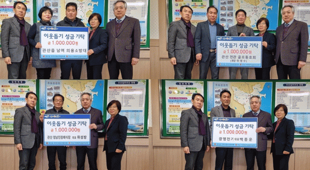 ÀåÈﱺ °ü»êÀ¾Àº Áö³ 30ÀÏ °ü»êÀ¾³²¿©ÀÇ¿ë¼Ò¹æ´ë, °ü»êõ°ü°ñÇÁµ¿È£È¸, ±¤¸íÀü±â, Á¤³²ÁøÀå·Ê½ÄÀå(´ëÇ¥ À§¼º¹æ)¿¡¼ °¢ 100¸¸¿øÀ» ±âŹÇß´Ù°í ¹àÇû´Ù.