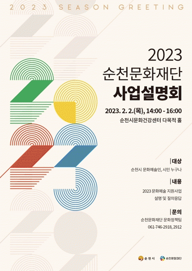¼øÃµ û¼Ò³â ¿ÀÄɽºÆ®¶óÀÇ ¿¬ÁÖ¸¦ ½ÃÀÛÀ¸·Î 2022³â ¼øÃµ¹®ÈÀç´Ü 22°³ »ç¾÷¿¡ ´ëÇÑ ¼º°ú °øÀ¯, 2023³â ¼øÃµ¹®ÈÀç´Ü¿¡¼ ÁøÇàÇϰí Áö¿øÇÏ´Â 14°³ »ç¾÷ ¼Ò°³¼øÀ¸·Î ÁøÇàµÈ´Ù. ¼³¸íȸ ÈÄ¿¡´Â °øÅë ÁúÀÇÀÀ´ä°ú 1Ãþ ·Îºñ¿¡¼ ÁøÇàµÇ´Â »ç¾÷º° ½ÉÃþ ÁúÀÇÀÀ´äÀÌ ÁøÇàµÉ ¿¹Á¤ÀÌ´Ù.