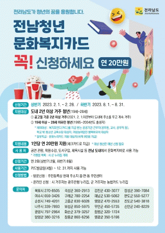 ¡®Àü³²Ã»³â ¹®Èº¹ÁöÄ«µå Áö¿ø»ç¾÷¡¯Àº Àü¶ó³²µµ ³» °ÅÁÖÇϴ û³âÀÇ ¹®È»ýȰ ÇâÀ¯ ¹× ÀÚ±â°è¹ß ±âȸ¸¦ Á¦°øÇÏ¿© û³â¼¼´ë Á¤ÂøÀ» µ½±â À§ÇØ ¹®Èº¹Áöºñ ¿¬ 20¸¸¿øÀ» Áö¿øÇÏ´Â »ç¾÷ÀÌ´Ù.