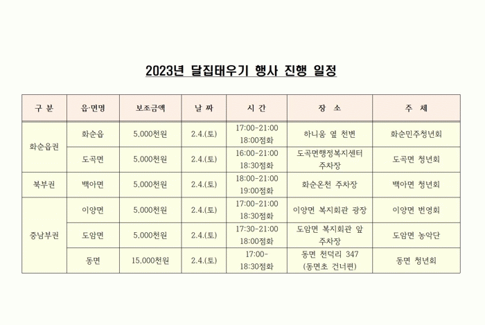 Çà»ç´Â ÇöÁö ¿©°Ç¿¡ µû¶ó ¿ÀÈÄ 4½ÃºÎÅÍ ¿ÀÈÄ 6½Ã »çÀÌ¿¡ ½ÃÀÛÇØ dz³â±â¿øÁ¦, ÁãºÒ³îÀÌ µî ¿©·¯ ¹Î¼ÓÇà»ç¿Í ÇÔ²² ÁøÇàµÈ´Ù. Á¤¿ù´ëº¸¸§ ³¯ÀÇ ¹é¹ÌÀÎ ¡®´ÞÁýÅ¿ì±â¡¯´Â ¡ãȼøÀ¾(18½Ã) ¡ãµµ¾Ï(18½Ã) ¡ãµ¿¸é(18½Ã 30ºÐ) ¡ãµµ°î(18½Ã 30ºÐ) ¡ãÀ̾ç(18½Ã 30ºÐ) ¡ã¹é¾Æ(19½Ã)¿¡ Á¡ÈµÉ ¿¹Á¤ÀÌ´Ù.