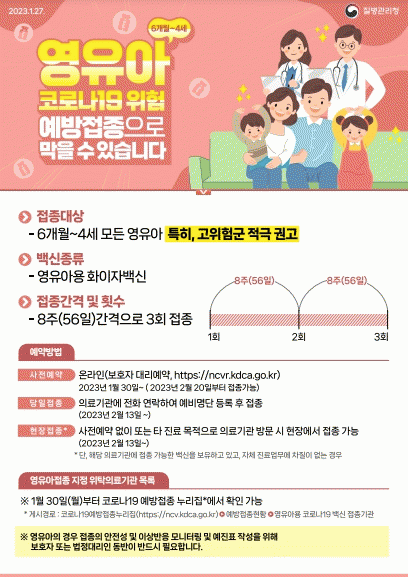 Á¢Á¾ ´ë»óÀº ¸¸ 6°³¿ù~4¼¼±îÁö ¿µÀ¯¾Æ·Î, ¡®23³â 2¿ù ±âÁØ 2022³â 8¿ù»ý Áß »ýÀÏÀÌ Áö³ ¿µ¾ÆºÎÅÍ 2018³â»ý Áß »ýÀÏÀÌ Áö³ªÁö ¾ÊÀº À¯¾Æ±îÁö´Ù. ƯÈ÷, ¸é¿ª ÀúÇϳª ±âÀúÁúȯ º¸À¯ µîÀ¸·Î °íÀ§Ç豺¿¡ ÇØ´çÇÏ´Â ¿µÀ¯¾ÆÀÇ °æ¿ì Á¢Á¾À» Àû±Ø ±Ç°íÇÑ´Ù.
