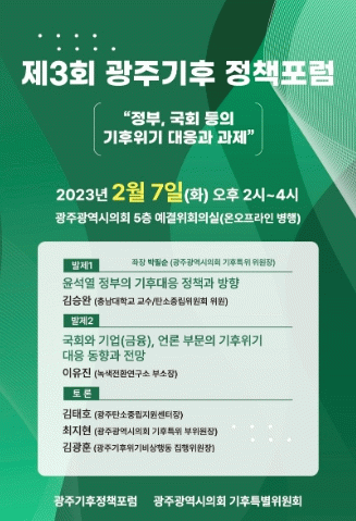 À̹ø Æ÷·³Àº °¡¹³°ú Æø¼³ µîÀ¸·Î ±¤ÁÖÁö¿ª¿¡ ±âÈĺ¯È¿¡ ´ëÇÑ À§±â°¨ÀÌ °íÁ¶µÇ´Â »óȲ¿¡¼ ±âÈÄÀ§±â Çö½ÇÀû ´ëÀÀ °úÁ¦¸¦ ¸ð»öÇϱâ À§ÇØ ¡®Á¤ºÎ, ±¹È¸ µîÀÇ ±âÈÄÀ§±â ´ëÀÀ°ú °úÁ¦¡¯¸¦ ÁÖÁ¦·Î ÁøÇàµÈ´Ù.