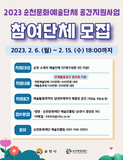¡®¼øÃµ¹®È¿¹¼ú´Üü °ø°£Áö¿ø»ç¾÷¡¯Àº ¿¹¼ú´ÜüÀÇ ¾ÈÁ¤ÀûÀΠȰµ¿±â¹Ý Á¶¼ºÀ» À§ÇÑ ÀÓÂ÷·á Áö¿ø»ç¾÷À¸·Î ´ÜüÀÇ Ã¢ÀÛÀÇ¿å °íÃë ¹× Áö¿ª ¹®È¿¹¼ú Ȱµ¿ Àå·Á¸¦ À§ÇØ ¿ÃÇØ·Î 3³â° À̾î¿À°í ÀÖ´Â »ç¾÷ÀÌ´Ù.