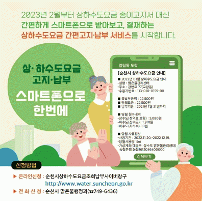 ½ÅûÀº ¼øÃµ½Ã»óÇϼöµµ¿ä±ÝÁ¶È¸³³ºÎ »çÀ̹öⱸ ¶Ç´Â ÀüÈ·Î °¡´ÉÇÏ´Ù. ÇØ´ç ¼ºñ½º¸¦ ½ÅûÇÏ¸é ±âÁ¸ Á¾ÀÌ °íÁö¼´Â ¹ß¼ÛµÇÁö ¾ÊÀ¸¸ç, °ÅÁÖÁö°¡ º¯°æ(ÀÌ»ç)µÇ¸é º°µµ·Î ÇØÁö ½ÅûÀ» ÇØ¾ßÇÑ´Ù.