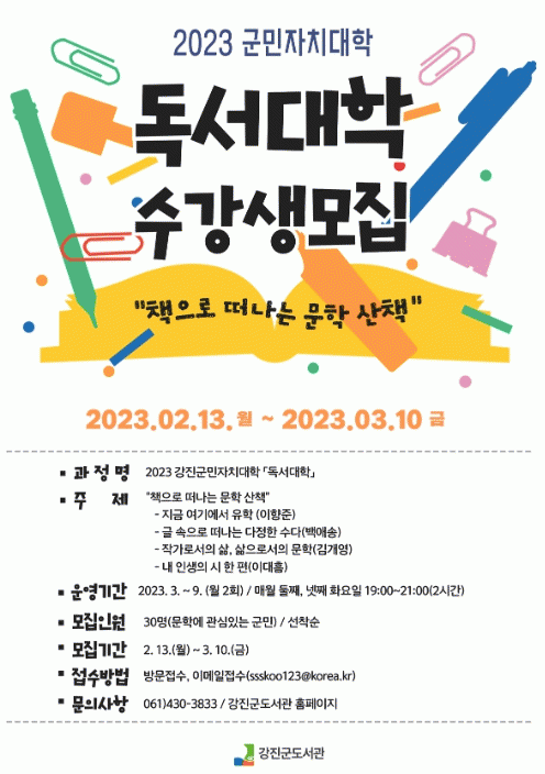 ¿ÃÇØ´Â ¡®Ã¥°ú ÇÔ²²ÇÏ´Â ¹®ÇÐ »êÃ¥¡¯À̶ó´Â ÁÖÁ¦·Î 3¿ù 14ÀϺÎÅÍ 9¿ù 26ÀϱîÁö ¸Å¿ù 2ȸ, È¿äÀÏ Àú³á 7½Ã¿¡ µµ¼°ü 3Ãþ ¾î¿ï¸²¹æ¿¡¼ ¿î¿µµÈ´Ù.
