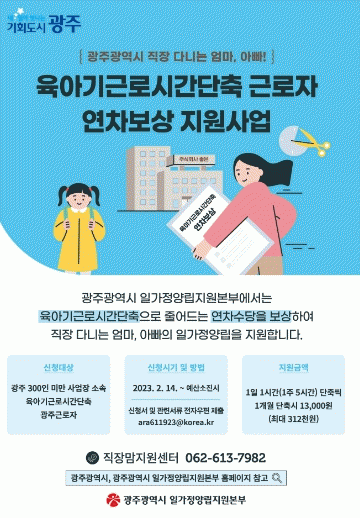 ¿ÃÇØ Áö¿ø ´ë»óÀº ±¤ÁÖ ¼ÒÀç 300ÀÎ ¹Ì¸¸ »ç¾÷Àå ¼Ò¼ÓÀ¸·Î, ¿ÃÇØ ¡®À°¾Æ±â ±Ù·Î½Ã°£ ´ÜÃà Á¦µµ¡¯¸¦ ÀÌ¿ëÇϰí À°¾Æ±â ±Ù·Î½Ã°£ ´ÜÃà ±Þ¿©¸¦ ¹Þ´Â ±Ù·ÎÀÚ´Ù.