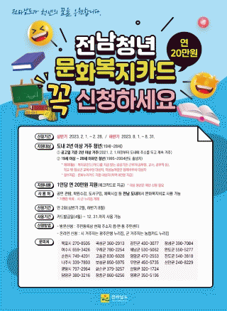 Áö¿ø±Ý 20¸¸ ¿øÀº ¹ß±ÞµÈ üũīµå¿¡ Æ÷ÀÎÆ®·Î Áö±ÞµÇ¸ç Àü³²µµ³»¿¡¼ ¿¬¸»±îÁö °ø¿¬ °ü¶÷, Çпø ¼ö°, µµ¼ ±¸ÀÔ, üÀ° Ȱµ¿ µî ¹®Èº¹Áöºñ·Î »ç¿ëÇÒ ¼ö ÀÖ´Ù.
