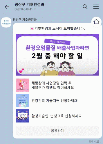 °¡ÀÔ´ë»óÀº ±¤»ê±¸ ´ë±â¡¤Æó¼ö ¹èÃâ½Ã¼³ ½Å°í ¹× Çã°¡ »ç¾÷ÀåÀÌ´Ù. īī¿ÀÅå¿¡¼ ¡®±¤»ê±¸ ±âÈÄȯ°æ°ú¡¯¸¦ °Ë»öÇÑ ÈÄ Ã¤³ÎÀ» Ãß°¡ÇÏ¸é µÈ´Ù.