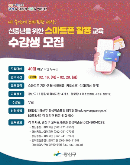 16ÀϺÎÅÍ 28ÀϱîÁö ±¤»ê±¸ Æò»ýÇнÀÆ÷ÅÐ ¡®¹è¿ì¶û²²¡¯¸¦ ÅëÇØ ½ÅûÇÒ ¼ö ÀÖ´Ù. °¢ º¹Áö°ü¿¡ ¹æ¹®Çϰųª ÀüÈÇØ Á¢¼öÇÏ´Â °Íµµ °¡´ÉÇÏ´Ù.