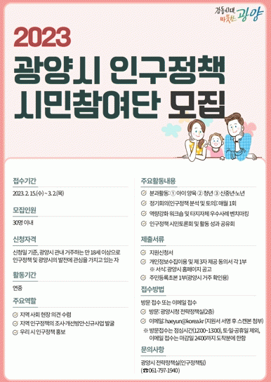 ¸ðÁý ±â°£Àº 2¿ù 15ÀϺÎÅÍ 3¿ù 2ÀϱîÁö À̸ç, Àα¸Á¤Ã¥¿¡ °ü½É ÀÖ´Â ¸¸ 18¼¼ ÀÌ»ó ±¤¾ç½Ã¹ÎÀ̶ó¸é ´©±¸³ª Âü¿©ÇÒ ¼ö ÀÖ´Ù.