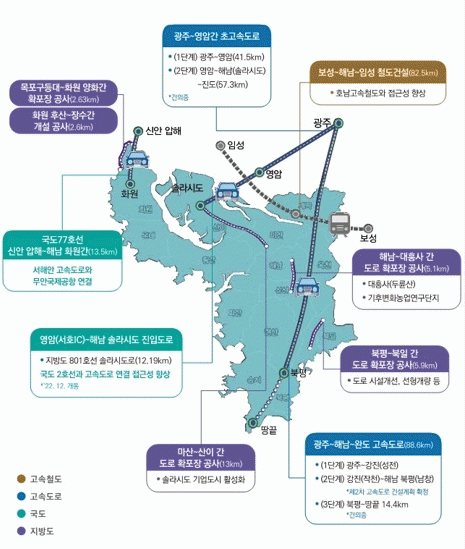 ±¤ÁÖ~³ªÁÖ~¿µ¾Ï~°Áø~ÇØ³²~¿Ïµµ¸¦ ÀÕ´Â °í¼Óµµ·Î »ç¾÷Àº ÃÑ¿¬Àå 88.61Km, 4Â÷¼± °í¼Óµµ·Î¸¦ °Ç¼³Çϱâ À§ÇØ ¾à 3Á¶ 4,000¾ï¿øÀÌ ¼Ò¿äµÇ¸ç, ±¤ÁÖ ¼±¸ º®Áøµ¿~°Áø ¼ºÀü 1´Ü°è(51.11km), °Áø ÀÛõ~ÇØ³² ºÏÆò 2´Ü°è(37.5km)·Î ³ª´©¾î ÃßÁø ÁßÀÌ´Ù.
