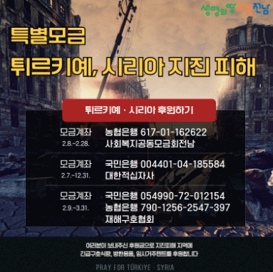 ±è¿µ·Ï Àü³²µµÁö»ç´Â ¡°À̹ø ÁöÁøÀ¸·Î »ç¶ûÇÏ´Â °¡Á·°ú »îÀÇ ÅÍÀüÀ» ÀÒ¾î¹ö¸° Æ¢¸£Å°¿¹.½Ã¸®¾Æ ±¹¹Î¿¡°Ô ¸¹Àº °ü½É°ú Áö¿øÀÌ ÇÊ¿äÇÏ´Ù¡±¸ç ¡°´ë±Ô¸ð ÁöÁøÀ¸·Î ÇÇÇØ¸¦ ÀÔÀº ºÐµéÀ» µ½±â À§ÇÑ ¼º±Ý ¸ð±Ý ¹× ±¸È£¹°Ç° ¸ðÁýȰµ¿À» ÇÔ²²ÇØ ´Þ¶ó¡±°í ´çºÎÇß´Ù.