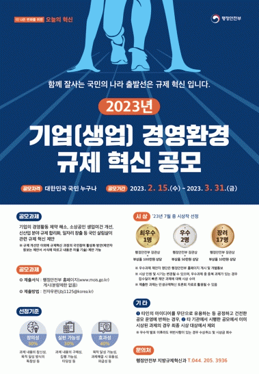 À̹ø °ø¸ðÀüÀº ¼Ò»ó°øÀΰú ±â¾÷ÀÇ »ý¾÷?°æ¿µÈ¯°æ °³¼± °úÁ¦¸¦ ÁßÁ¡ ¹ß±¼?°³¼±Çϱâ À§ÇØ ¡®ÇÔ²² Àß»ç´Â ±¹¹ÎÀÇ ³ª¶ó Ãâ¹ß¼±Àº ±ÔÁ¦Çõ½ÅÀÔ´Ï´Ù¡¯¶ó´Â ÁÖÁ¦·Î ¿À´Â 3¿ù 31ÀϱîÁö ÁøÇàµÈ´Ù.