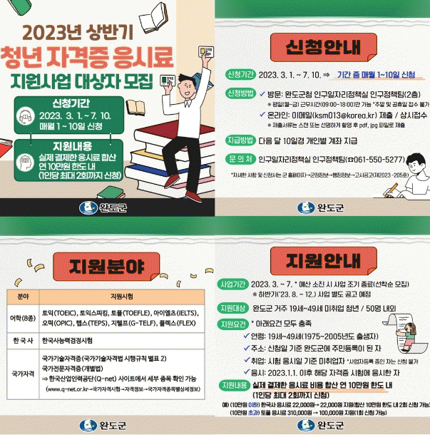 Áö¿ø ´ë»óÀº ½ÅûÀÏ ±âÁØ ¿Ïµµ±º¿¡ ÁÖ¼Ò¸¦ µÐ 19¼¼~49¼¼ ¹ÌÃë¾÷ û³âÀ̸ç, 2023³â 1¿ù 1ÀÏ ÀÌÈÄ ¾îÇÐ(8Á¾), Çѱ¹»ç, ±¹°¡ ÀÚ°ÝÁõ(±¹°¡ ±â¼ú ÀÚ°ÝÁõ, ±¹°¡ Àü¹® ÀÚ°ÝÁõ)À» ½ÇÁ¦·Î ÀÀ½ÃÇÑ Ã»³âÀÌ¸é ½ÅûÇÒ ¼ö ÀÖ´Ù.