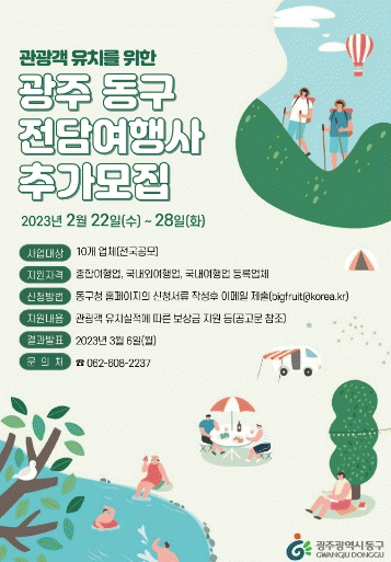 ¸ðÁý ´ë»óÀº Á¾ÇÕ¿©Çࡤ±¹³»¿Ü¿©Çࡤ±¹³»¿©Çà¾÷ µî·Ï¾÷üÀÌ´Ù. Àü´ã¿©Çà»ç·Î ÁöÁ¤µÇ¸é 3¿ùºÎÅÍ 12¿ù±îÁö ¡ã±¤ÁÖ µ¿±¸ ü·ù¡¤Ã¼ÇèÇü °ü±¤»óǰ °³¹ß ¡ãµ¿±¸ °ü±¤ È«º¸ ¹× °ü±¤°´ À¯Ä¡ ¡ã°ü±¤¹Ú¶÷ȸ µ¿±¸È«º¸°ü °øµ¿ ±âȹ ¿î¿µ ¡ã±¤ÁÖÁö¿ª ¿©Çà»ç Çù¾÷À» ÅëÇÑ °øµ¿ °ü±¤»óǰ ¿î¿ë µî ¾÷¹«¸¦ ´ã´çÇÑ´Ù.
