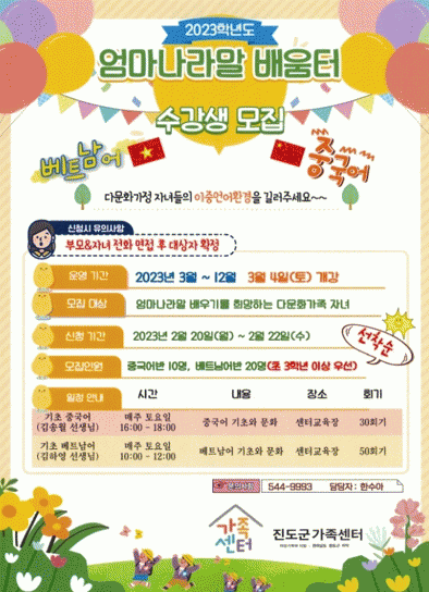 ¸ðÁýÀοøÀº Áß±¹¾î¹Ý 10¸í, º£Æ®³²¾î¹Ý 20¸íÀ¸·Î ¸ÅÁÖ Åä¿äÀÏ 2½Ã°£À̸ç, ±³À°Àº Áøµµ±º °¡Á·¼¾ÅÍ¿¡¼ ½Ç½ÃµÈ´Ù.