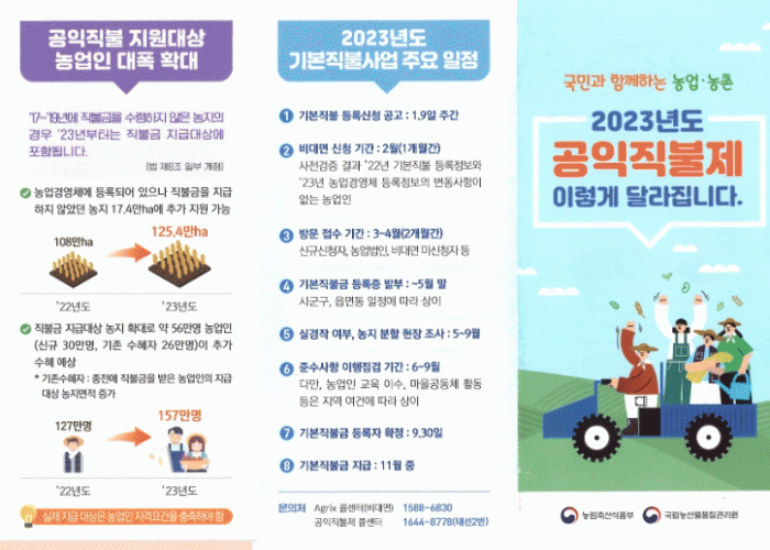±âº»Çü °øÀÍÁ÷ºÒÁ¦´Â ³ó¾÷¡¤³óÃÌÀÇ °øÀͱâ´É ÁõÁø°ú ³ó¾÷ÀÎÀÇ ¼Òµæ¾ÈÁ¤À» À§ÇØ ÀÏÁ¤ ÀÚ°ÝÀ» °®Ãß°í Áؼö»çÇ×À» ÀÌÇàÇÏ´Â ³ó¾÷Àο¡°Ô Á÷ºÒ±ÝÀ» Áö¿øÇÏ´Â Á¦µµÀÌ´Ù. °øÀÍÁ÷ºÒ±ÝÀ» ¹ÞÀ¸·Á´Â ³ó¾÷ÀÎÀº ¸Å³â µî·Ï½Åû¼¿Í °ü·Ã ¼·ù¸¦ °üÇÒ À¾¸é»ç¹«¼Ò¿¡ Á¦ÃâÇÏ¿© ½ÅÃ»ÇØ¾ß ÇÑ´Ù.
