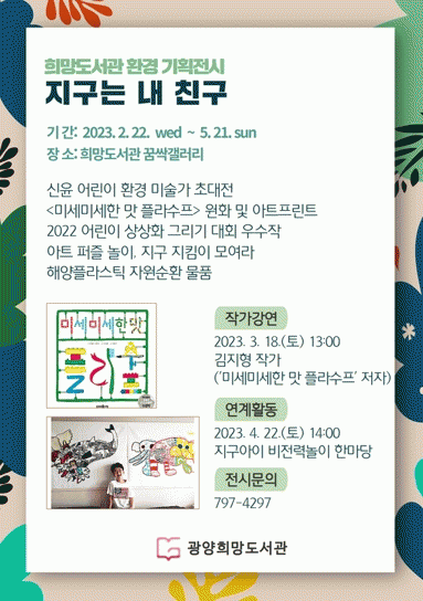 Àü½Ã ¿¬°è ÇÁ·Î±×·¥À¸·Î´Â 3¿ù 18ÀÏ¿¡ ±èÁöÇü ÀÛ°¡ÀÇ °¿¬°ú µµ½¼Æ®°¡, 4¿ù 22ÀÏ¿¡´Â Àü³²³ì»ö¿¬ÇÕ°ú Çù¾÷ÇØ ¡°Áö±¸¾ÆÀÌ ºñÀü·Â³îÀÌ ÇѸ¶´ç¡± Çà»ç°¡ ÁøÇàµÉ ¿¹Á¤ÀÌ´Ù. À̹ۿ¡ Àü½ÃÀåÀ» ¹æ¹®ÇÑ ¾î¸°À̸¦ À§ÇØ Àü½ÃÀÛǰÀ¸·Î ¸¸µç ¾ÆÆ® ÆÛÁñ ³îÀÌ, Áö±¸ÁöÅ´ÀÌ ½Çõ ¾à¼ÓÇϱâ, ÀÛ°¡¿¡°Ô ÆíÁö ¾²±â°¡ ÁغñµÇ¾î ÀÖ´Ù.
