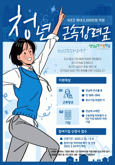 Àü³²µµ´Â 2016³âºÎÅÍ Ã»³â ±Ù¼ÓÀå·Á±Ý Áö¿ø»ç¾÷À» ÀÚü ÃßÁøÇØ µµ³» Áß¼Ò±â¾÷ Àη³ ÇØ¼Ò¿Í û³â Àα¸ À¯Ãâ ¹æÁö¿¡ Èû¾²°í ÀÖ´Ù. 2021³â »ç¾÷¿¡ Âü¿©ÇÑ 360°³ ±â¾÷°ú û³â 974¸í¿¡ ´ëÇÑ °í¿ëÀ¯ÁöÀ²Àº 80.6%·Î Á¶»çµÆ´Ù.