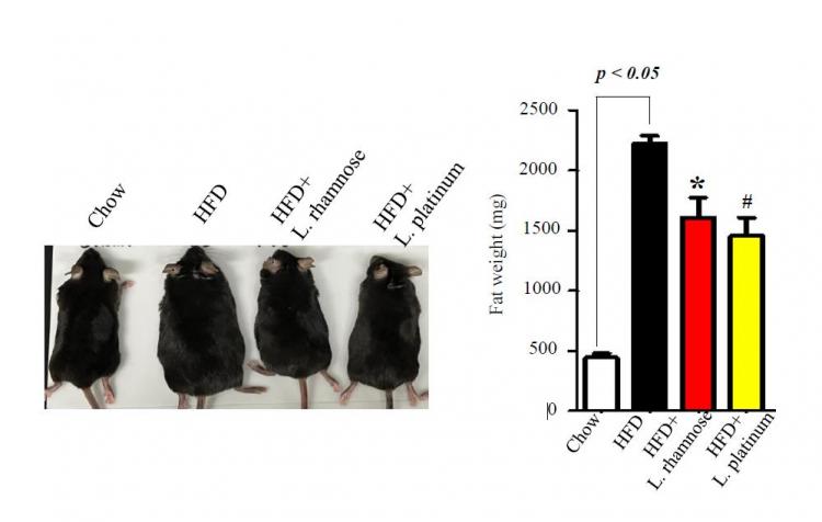 (±×¸² 1) °íÁö¹æÀÌ½Ä ¸¶¿ì½º (HFD)¿¡ À¯»ê±ÕÀ» Åõ¿©ÇÑ ¸¶¿ì½º (Chow; ´ëÁ¶±º, HFD; °íÁö¹æ½Ä, HFD+Lactobacillus Rhamnoses, HFD+ Lactobacillus Platinum)