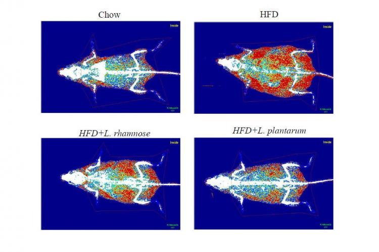 (±×¸² 2) °íÁö¹æÀÌ½Ä ¸¶¿ì½º (HFD)¿¡ À¯»ê±ÕÀ» Åõ¿©ÇÑ ¸¶¿ì½ºÀÇ ´ÜÃþ ÃÔ¿µ (DEXA) (Chow; ´ëÁ¶±º, HFD; °íÁö¹æ½Ä, HFD+ Lactobacillus Rhamnoses, HFD+ Lactobacillus Platinum)