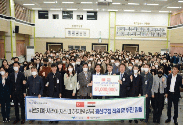 ±¤»ê±¸´Â Áö³ 2¿ùºÎÅÍ ÁöÁø ÇÇÇØ º¹±¸ Áö¿ø ¼º±Ý ¸ð±ÝÀ» ÁøÇàÇß´Ù. ¹Úº´±Ô ±¤»ê±¸Ã»ÀåÀ» ºñ·ÔÇØ 45°³ Àü ºÎ¼, 21°³ µ¿ Àü Á÷¿øÀÌ Æ¢¸£Å°¿¹?½Ã¸®¾Æ ½Ã¹ÎÀÇ ÀÏ»óȸº¹À» ÀÀ¿øÇÏ´Â ¸¶À½À¸·Î Àû±Ø Âü¿©Çß´Ù.