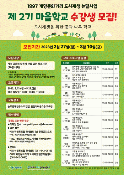 ¿ÃÇØ ÁøÇàµÇ´Â 2±â ±³À°Àº ¡®µµ½ÃÀç»ýÀ» À§ÇÑ ²É°ú ³ª¹« Çб³¡¯¸¦ ÁÖÁ¦·Î ¿À´Â 13ÀϺÎÅÍ 5¿ù 29ÀϱîÁö ¸ÅÁÖ ¿ù¿äÀÏ 12ȸ¿¡ °ÉÃÄ ¼Ûµµ°ø¿¹¿¬±¸¼Ò(º¸±¤µ¿ 2°¡) ÀÛ¾÷½Ç µî¿¡¼ ÁøÇàµÈ´Ù. ¼ö°»ýÀº ¿À´Â 3¿ù 10ÀϱîÁö ¸ðÁýÇÑ´Ù.