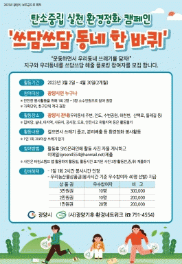 ¡®¾²´ã¾²´ã µ¿³× ÇÑ ¹ÙÄû Ç÷α롯 Ä·ÆäÀÎÀº ½Ã¹ÎÀÌ Âü¿©Çϴ ȯ°æÁ¤È Ȱµ¿°ú ºÐ¸®¹èÃâÀ» ÅëÇØ ÄèÀûÇÑ ±¤¾ç½Ã ȯ°æÀ» Á¶¼ºÇÏ°í »ýÅÂȯ°æ º¸È£¿¡ ´ëÇÑ ÀνÄÀ» ³ôÀ̱â À§ÇØ ¿ÃÇØ·Î 3ȸ° ÃßÁøÇϰí ÀÖ´Ù.