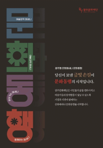 ±¤ÁÖÇü ¹®È¸Þ¼¼³ªÀÎ ¡®¹®Èµ¿Ç࡯Àº ¹®È¿¹¼ú¿¡ °ü½É ÀÖ´Â ½Ã¹Î, ±â¾÷ÀÇ ±âºÎ¸¦ ÅëÇØ ¿¹¼úÀÎÀÇ Ã¢ÀÛȰµ¿À» Áö¿øÇÏ´Â »ç¾÷ÀÌ´Ù.