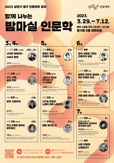À̿ܿ¡µµ ¡ãÀ̵¿¼ø Á¶¼±´ë ±³¼ö(¿ª»ç Àι°·Î ¹è¿ì´Â ±¤ÁÖÁ¤½Å) ¡ãÁ¤¿ìö µµ½¼Æ®(Ŭ·Îµå¸ð³×-ÀλýÀÇ ºûÀ» ±×¸®´Ù) ¡ã¼ÛÇʰæ(½º¹°´Ù¼¸ °æ»óµµ ´ëÇлýÀÌ º» 5¡¤18Ç×Àï) ¡ãÃÖ¿Ï¿í ±¤ÁÖÀå¾ÖÀÎÀαǼ¾ÅÍÀå(½Å±â¼ú ȯ°æ°ú ³ëµ¿ÀÇ ¹Ì·¡ ³ëµ¿ÀαÇ) ¡ãÀ̸íÇö õ¹®ÇÐÀÚ(º°À» º»´Ù´Â °Í) ¡ã½ÅµµÇö ÀÛ°¡(¸»ÀÇ ³»°øÀ» ±â¸£´Â Àι®ÇÐÀû ¹æ¹ý) ¡ã±èâÇö(¾öȤÇÑ Çѹݵµ Á¤¼¼¿Í ¿ì¸® ¹ÎÁ·ÀÇ °úÁ¦) ¡ã±èÅÂÇü »çȸ ½É¸®ÇÐÀÚ(°¡Â¥ Çູ ±ÇÇÏ´Â »çȸ) ¡ã±Ç±èÇö¿µ ¿©¼ºÇö½Ç¿¬±¸¼Ò ´ëÇ¥(¼ºÆòµîÀÇ »õ·Î¿î ½ÃÁð) ¡ã¼ºÁø±â Àü³²´ë ¸í¿¹±³¼ö(³ª¸¦ ¾î¶»°Ô »ç¶ûÇÒ±î?) µî ¹®ÇÐ, ¿¹¼ú, öÇÐ, ½É¸® µî ´Ù¾çÇÑ ºÐ¾ßÀÇ °»çµéÀÌ ¸±·¹ÀÌ °¿¬À» ÆîÄ£´Ù.