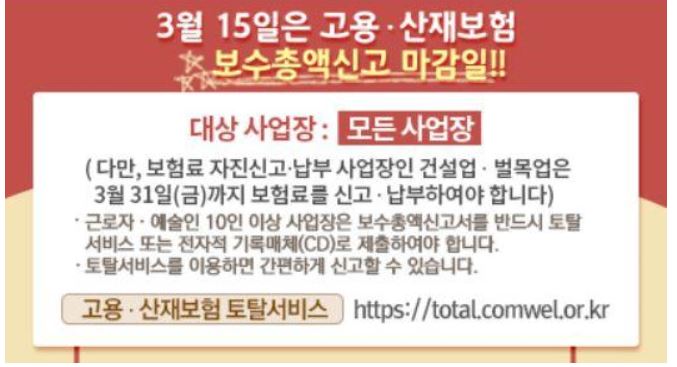 º¸¼öÃÑ¾× ¹× º¸Çè·á¸¦ ½Å°íÇÒ ¶§´Â ±Ù·Îº¹Áö°ø´Ü¿¡¼ ¿î¿µÇÏ´Â °í¿ë¡¤»êÀ纸Çè ÅäÅ»¼ºñ½º(total.comwel.or.kr)¸¦ ÀÌ¿ëÇÏ¸é ½±°í ºü¸£°Ô ½Å°íÇÒ ¼ö ÀÖ´Ù.