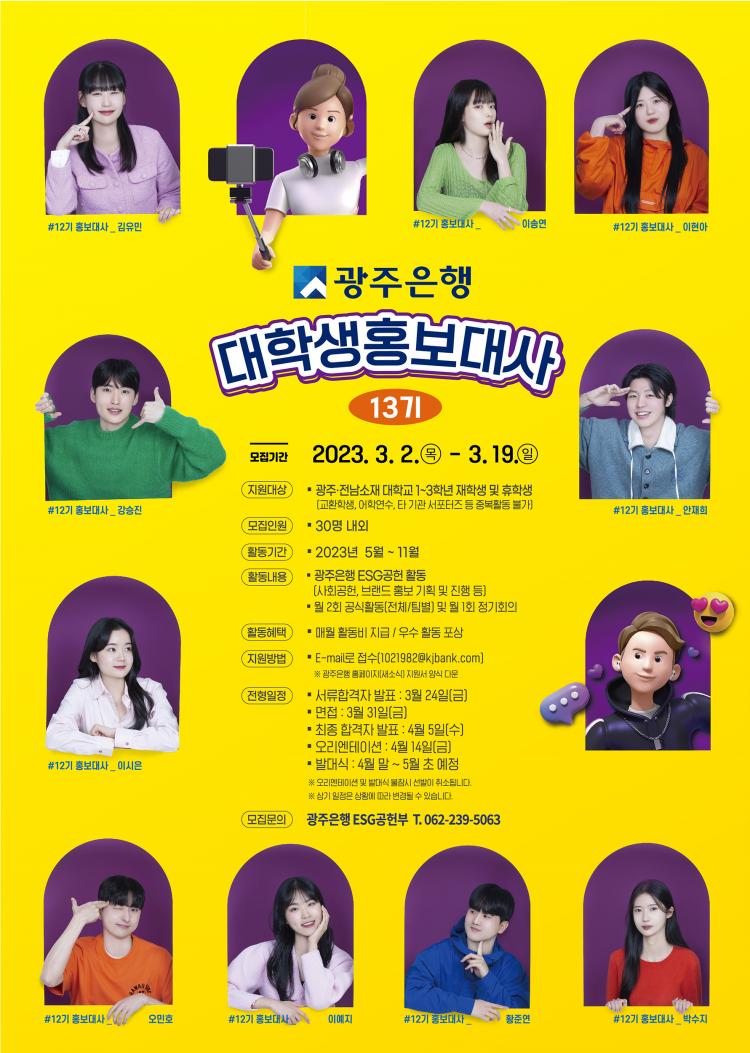 13±â ±¤ÁÖÀºÇà ´ëÇлý È«º¸´ë»ç´Â 4¿ù ¸» ¹ß´ë½ÄÀ» ½ÃÀÛÀ¸·Î 11¿ù±îÁö ±¤ÁÖÀºÇà »çȸ°øÇåȰµ¿ Âü¿©¿Í ºê·£µå È«º¸, À¯½º(Youth) °í°´°úÀÇ ¼ÒÅë, ´Ù¾çÇÑ ÄÜÅÙÃ÷ Á¦ÀÛ°ú ´º¹Ìµð¾î¸¦ Ȱ¿ëÇÑ È°µ¿À» ÅëÇØ ´ëÇлýµéÀÇ ÅåÅå Æ¢´Â ¾ÆÀ̵ð¾î¿Í ÀþÀ½ÀÇ ¿¡³ÊÁö·Î ±¤ÁÖÀºÇà ESG Ȱµ¿ÀÇ ¼Æ÷ÅÍÁî ¿ªÇÒÀ» ¼öÇàÇÒ ¿¹Á¤ÀÌ´Ù.
