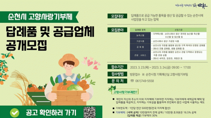 ½Ã´Â Áö³ 1¿ùºÎÅÍ Áö¿ª¿¡¼ »ý»êµÈ ³óÃà»ê¹°, °¡°ø½Äǰ, °ø¿¹Ç°°ú 2023¼øÃµ¸¸±¹Á¦Á¤¿ø¹Ú¶÷ȸ ÀÔÀå±Ç, ¼øÃµ»ç¶û»óǰ±Ç µî 48Á¾ÀÇ ´ä·ÊǰÀ» ¼±Á¤ÇÏ¿© Á¦°øÇϰí ÀÖÀ¸¸ç, À̹ø Ãß°¡ °ø¸ð¸¦ ÅëÇØ ¼øÃµ¸¸ÀÇ Æ¯»öÀ» Áö´Ñ ´Ù¾çÇÑ ´ä·ÊǰÀ» ¼±Á¤ÇÏ°í ±âºÎ À¯ÀÎ È¿°ú·Î Áö¿ª°æÁ¦ Ȱ¼ºÈ¸¦ °ßÀÎÇÒ ¿¹Á¤ÀÌ´Ù.