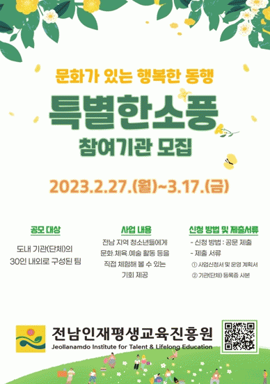 ¡®Æ¯º°ÇÑ ¼Òdz¡¯Àº Àü³² û¼Ò³âÀÇ ±³½Ç ¹Û ¹®È.¿¹¼ú.üÀ° µî üÇèȰµ¿À» Áö¿øÇÏ´Â »ç¾÷ÀÌ´Ù. Áö³ÇØ 11°³ ±â°ü 388¸íÀÇ ÇлýÀÌ »ç¾÷¿¡ Âü¿©ÇØ ¹Ú¹°°ü, ¹ÂÁöÄÃ, ½ºÆ÷Ã÷ °æ±â °ü¶÷ µî ´Ù¾çÇÑ Ã¼ÇèÀ» Çß´Ù.